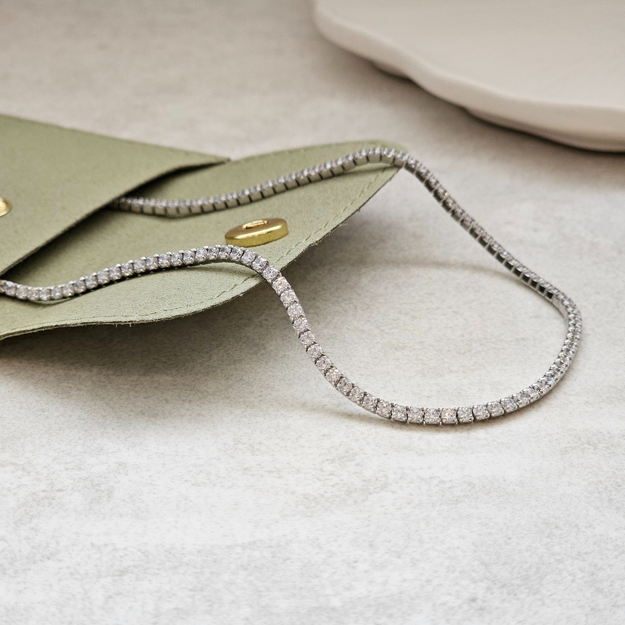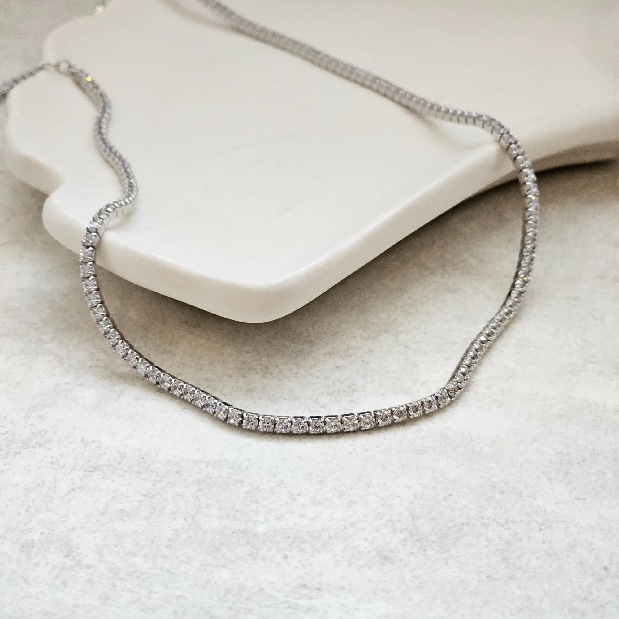 Elevate your everyday elegance with this stunning Tennis Necklace in sterling silver. Featuring a continuous line of brilliant stones that catch the light beautifully, this piece delivers timeless sparkle and sophistication. Perfect for layering or wearing solo, its refined design complements any outfit from casual to formal. Whether treating yourself or gifting to someone special, this gift-able necklace makes an unforgettable impression. Perfect for brides and bridesmaids too! A versatile essential that transforms any look into something truly radiant.