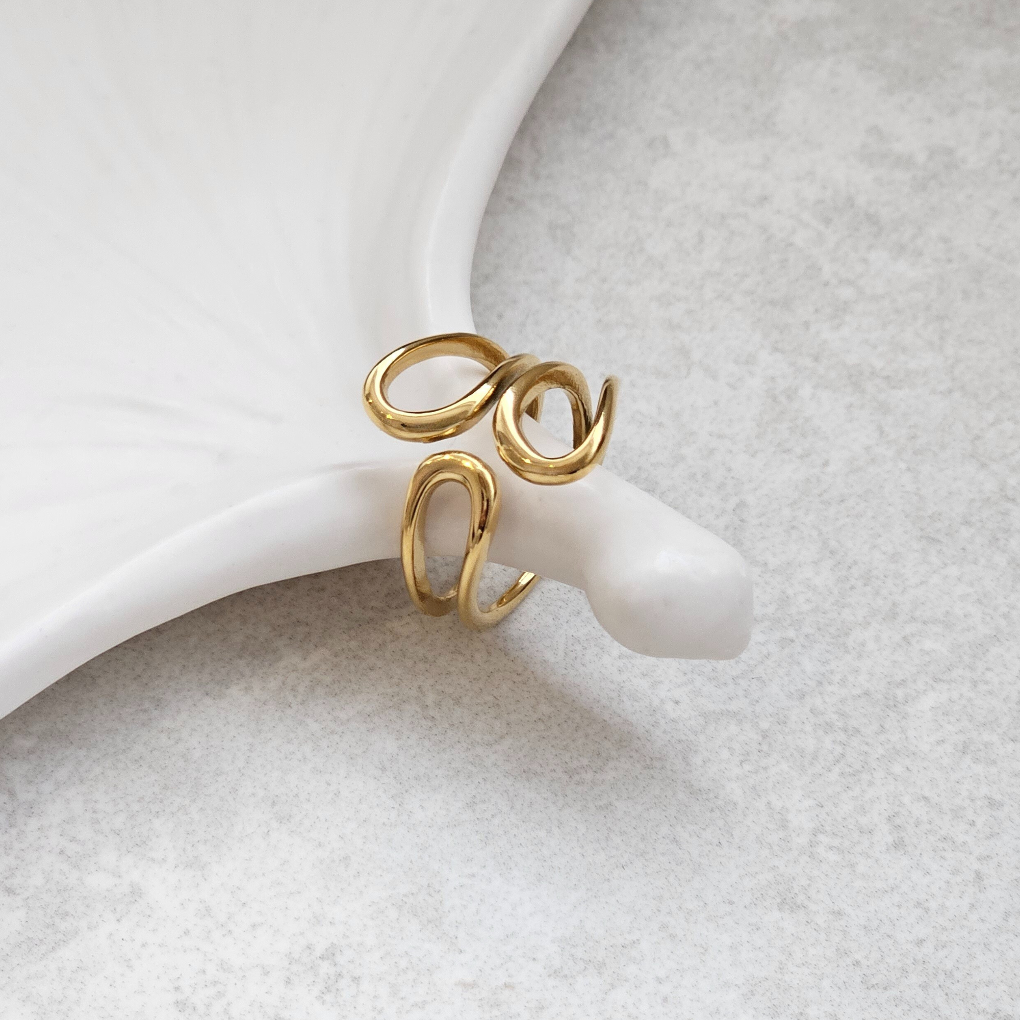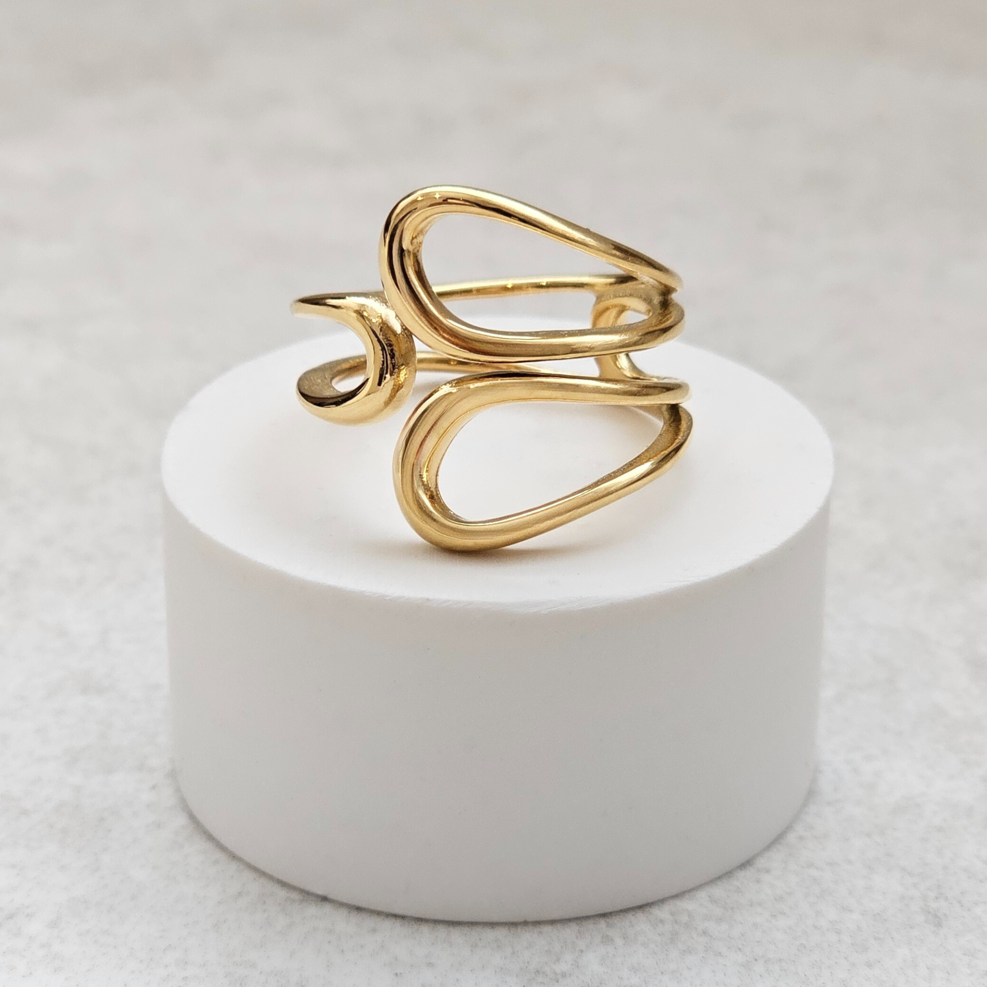 Discover the perfect blend of art and wearability with this Sculptural Ring in gold. Its organic, flowing shape makes a bold statement while remaining comfortable for everyday wear. Crafted to be completely waterproof, this ring withstands daily life without compromise, shower, swim, or simply live freely without worry. The non-tarnish finish ensures your investment maintains its lustrous beauty for years to come, eliminating the need for constant maintenance.